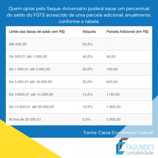 O trabalhador que fizer a opção poderá sacar um percentual do saldo do FGTS acrescido de uma parcela adicional, anualmente. Veja a tabela!